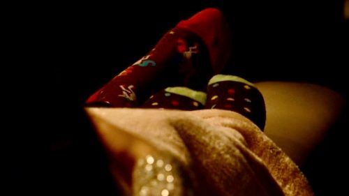 [ Liz and Agnes are snuggled up together on a couch in the airplane. Agnes sees that Liz is wearing the socks with the unicorns of them ]