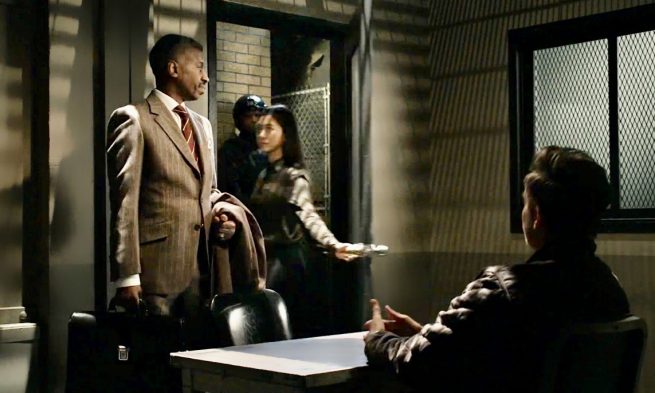 [ Panabaker and the team watch as Reginald Cole and his lawyer Tyson Lacroix walk by ]