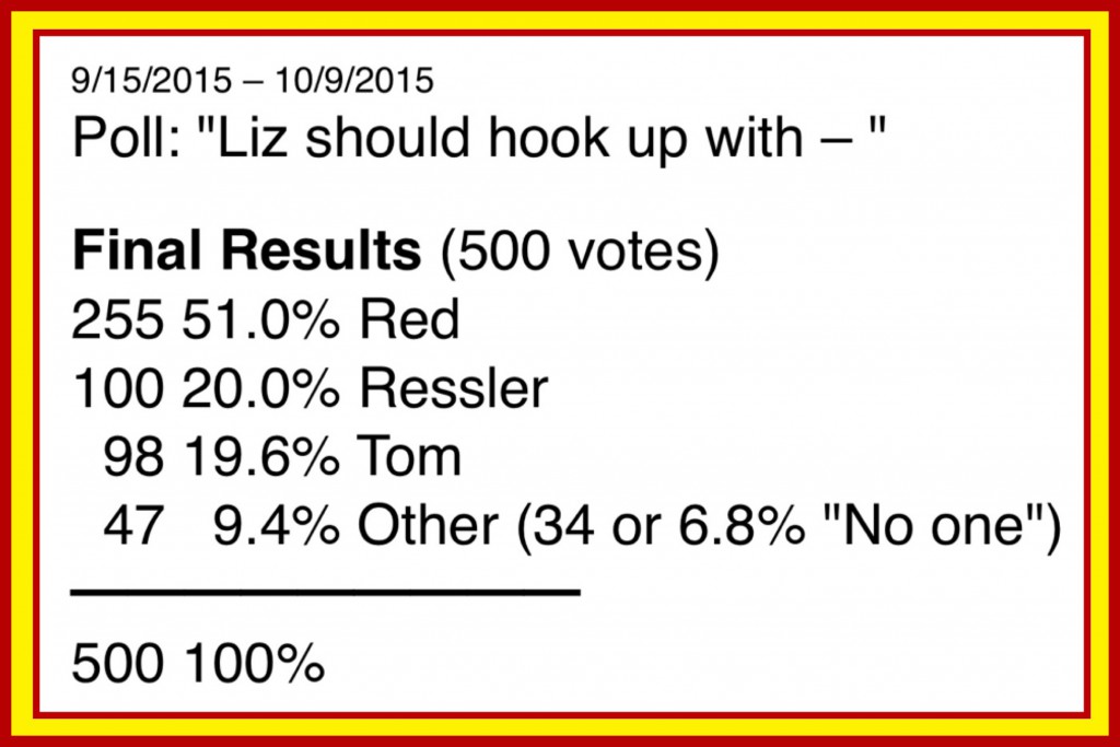 Red in red light. Liz in golden light. [2:9]